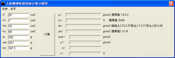 本程序完全參照《土力學與基礎工程》(趙明華主編)第23節內容編寫,僅供學習使用,敬請指教。 土力學中關于土的物理性指標的計算,包括密度(重度)、含水量、孔隙比、飽和度、液性指數、塑性指數等的計算。