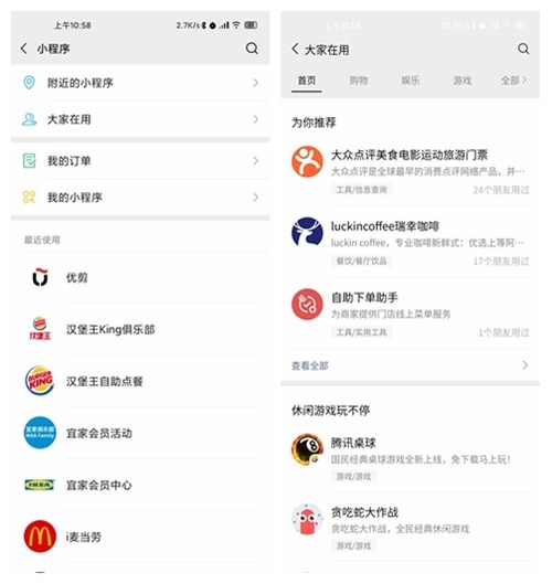 小程序頁面這一次也進行了不小的改動,增加了“建議使用”、“常用服務”、“動態”幾個新的標簽以及一個“大家在用”,會展示你的好友正在使用的小程序并且以類別進行分類,便于查詢。
