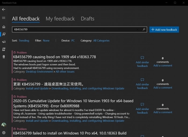 在微軟的論壇、Reddit和社交媒體上擁有不少關于Windows 10累積更新的問題,其中包括藍屏、停止響應以及設備黑屏的問題。此外還有用戶報告存在Windows 10網絡適配器的問題,一些使用LTE調制解調器的PC可能無法上網。