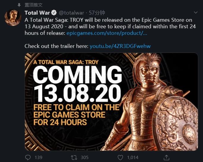 根據(jù)《全面戰(zhàn)爭》官方推特的消息,《全面戰(zhàn)爭傳奇:特洛伊》將于 8 月 13 日上線 Epic,24 小時內可以免費領取。
