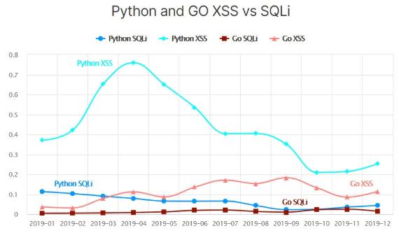 接下來,該公司又對兩種最常見的攻擊——XSS 和 SQLi——以及通過 Go 和 Python 使用這些攻擊的嘗試進行了觀察。值得注意的是,到 2019 年底,Go 在兩種類型的攻擊中都趕上了 Python。不過,判斷這種趨勢是否會持續還為時過早,但 Go 變得越來越流行是毋庸置疑的。