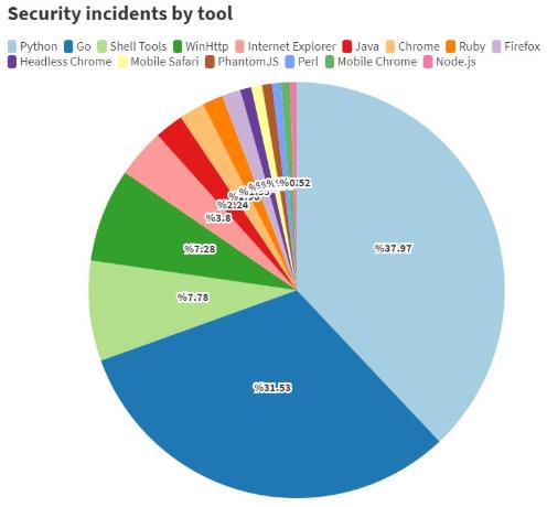 按工具來分類,Python 依舊是大多數黑客的首選武器,緊接著是使用量增長迅速的 Go 語言;再其次是 WinHttp 庫,該庫主要由 Windows 上運行的 .net 和 CPP 使用;Shell 工具(如 cURL、wget 等)也榜上有名。瀏覽器也是常用的攻擊工具。