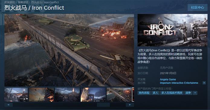 近日,由安琪拉游戲自主研發、帝國影游發行的近現代軍事戰爭RTS游戲Iron Conflict(中文名:烈火戰馬)正式宣布,將在2021年1月8日開啟Steam搶先體驗,國區售價50元,本作支持簡體中文、繁體中文、英文、俄語、土耳其語5種語言,官方同時還公布了先導預告片。