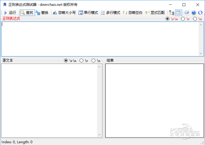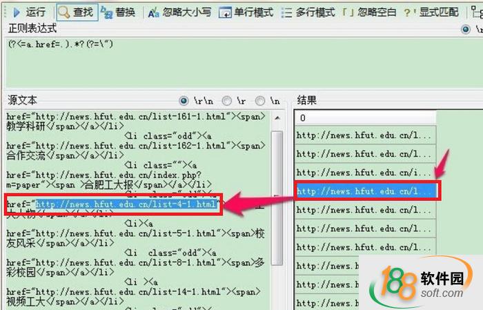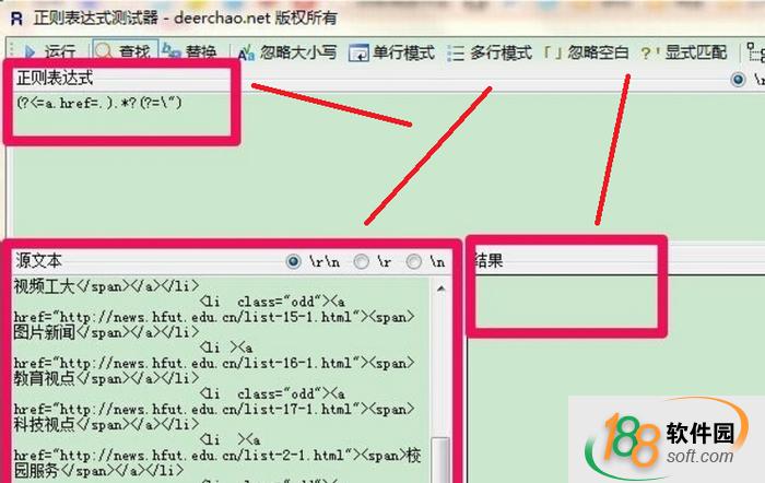 1、打開軟件,在“正則表式框”中寫出你的正則表達式,點擊“運行”,匹配出的字符串就在右側中一一展現