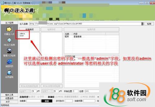 9、這里就已經檢測出了賬號密碼相關表段,一般首選“admin” 或者“administratior”或者user等管理員賬號敏感字符。檢測完成后,再勾選密碼字段,選擇檢測內容,就能檢測出管理員的登錄賬號密碼