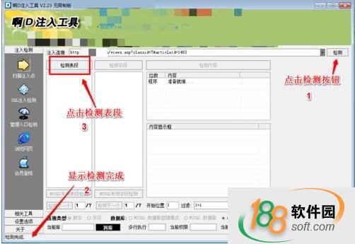 7、單擊“檢測表段”,此項會掃描數據庫中有沒有可注入的注冊表。若沒有,則執行步驟5。直到有可注入的注冊表為止