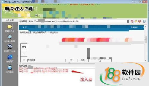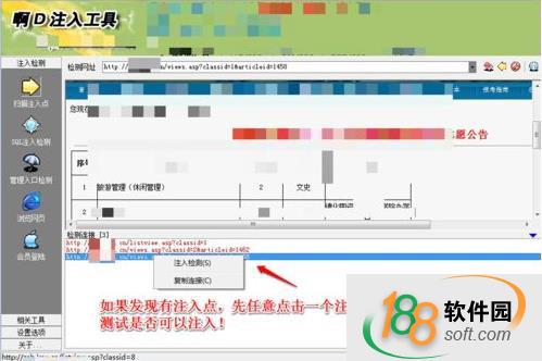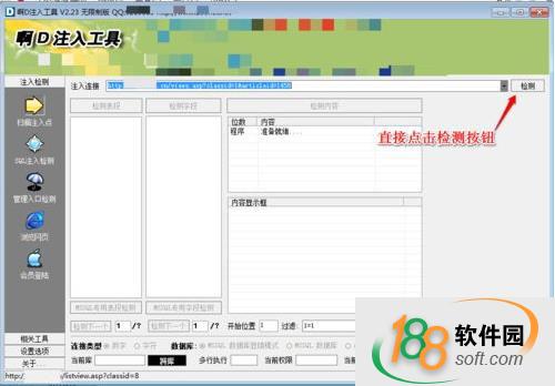 5、雙擊一條可用注入鏈接,界面自動跳轉到“SQL注入檢測”