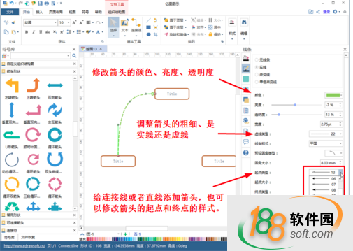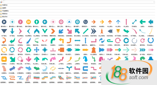 打開軟件后,點擊左側符號庫,找到“箭頭形狀”的符號庫,然后可以選擇各種已經設計好的箭頭,將它們拖拽到繪圖界面使用就行。