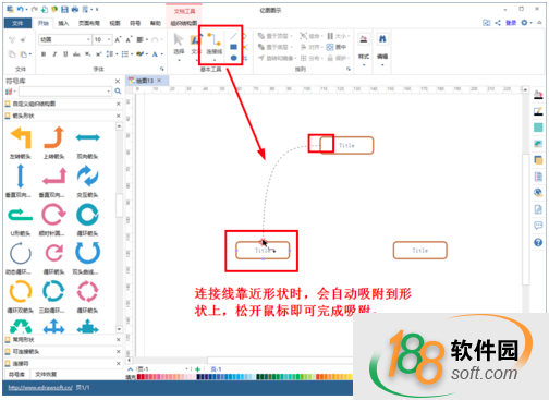 首先在繪圖界面,點擊開始菜單欄中的連接線工具下方的倒三角按鈕,選擇“曲線連接線”,畫出一條線,