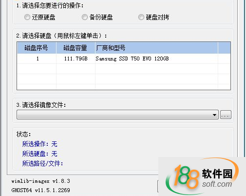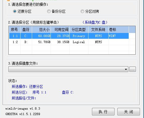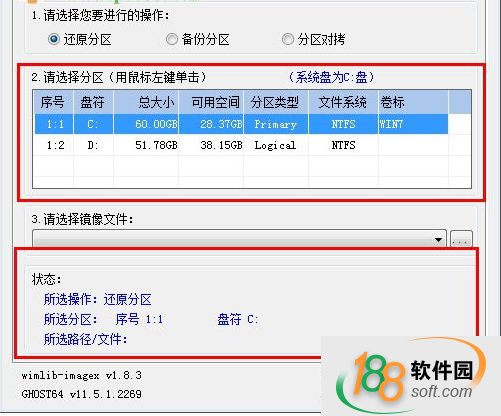 2、選擇您需要進行使用的分區,包括了序號、盤符、總大小、可用空間、文件系統、可對您需要使用的鏡像文件進行選擇、軟件的狀態查看等;