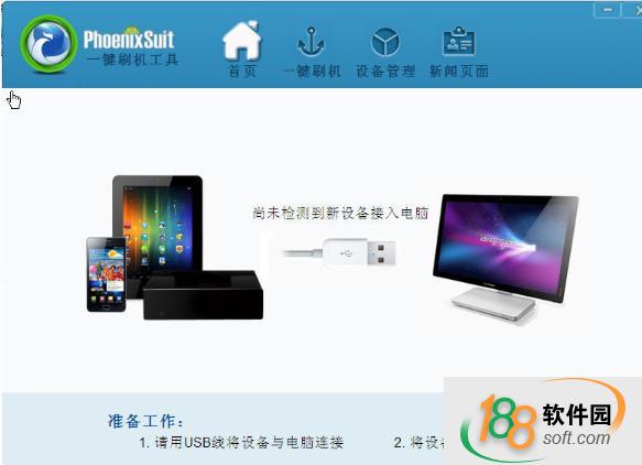 運(yùn)行PhoenixSuit 程序時(shí)默認(rèn)進(jìn)入的第一個(gè)模塊,也可以通過(guò)點(diǎn)擊按鈕 進(jìn)入主頁(yè)界面。