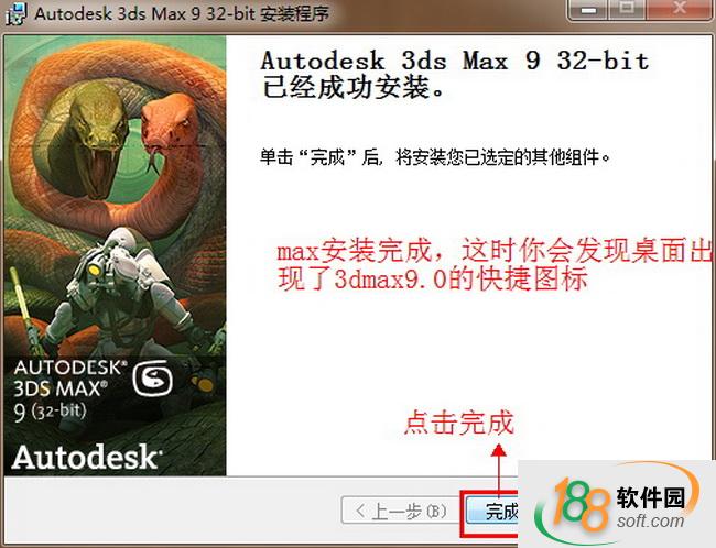 過了一會,3dmax9.0 32位中文版安裝完成,點擊完成安裝,這時你會發現桌面上出現了3dmax9.0 的快捷方式。