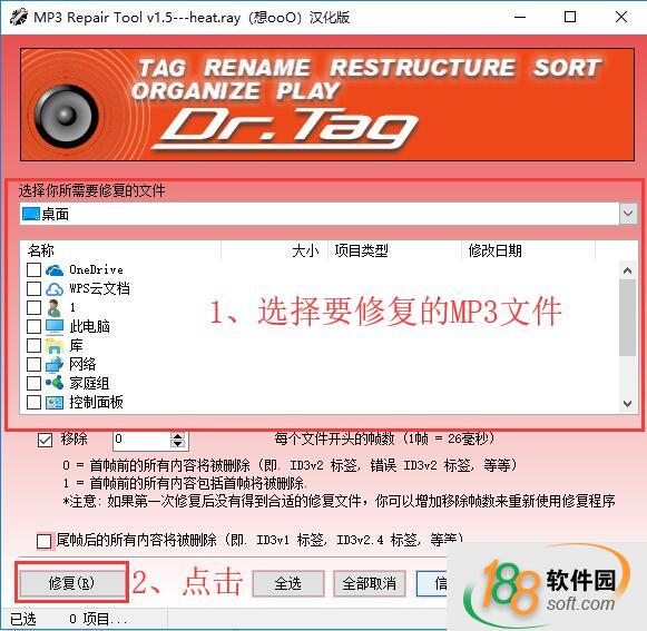 1、打開mp3修復工具,在選擇框中勾選想要進行修復的MP3文件