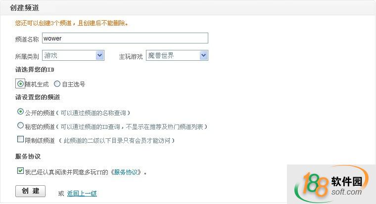 2.輸入頻道名稱,填寫頻道主打游戲。寫入簡單的頻道介紹,選擇所要建立的頻道用戶主要的網絡類型。目前頻道都是雙線頻道,所以不需要選擇頻道線路。