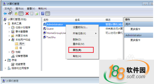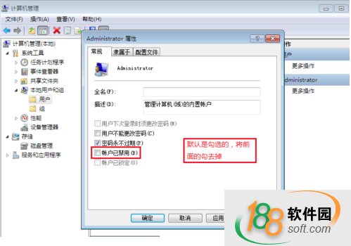 啟用Administrator帳戶過程:“計算機”右鍵 ->“計算機管理”->"系統工具" ->“本地用戶和組”,找到“Administrator”,然后右鍵“屬性”,打開“Administrator屬性”窗口。