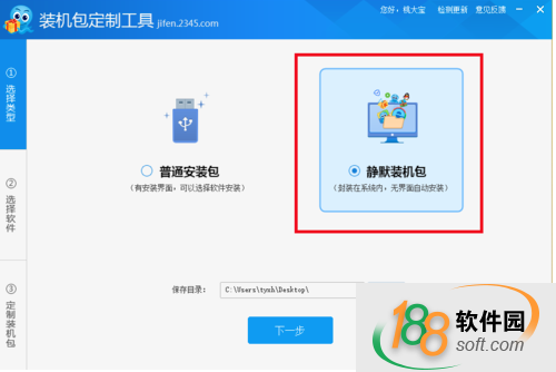 2、選擇“靜默裝機包”,然后選擇保存目錄,點擊“下一步”按鈕
