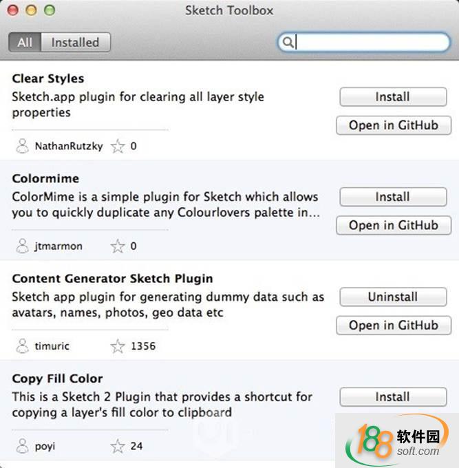 但是,使用這種方法安裝插件,需要一個個的找插件,非常麻煩。那么大家還記得靜電在第一節的sketch教程中給大家的兩個下載地址嗎?一個是sketch安裝文件,另一個就是關于插件的sketch toolbox。地址再貼一次給大家,沒有下的同學一定要裝哦(sketch toolbox下載地址:http://pan.baidu.com/s/1dD3VeUX),下載并安裝后即可使用。打開sketch toolbox,大家會看到各種各樣的插件,如下圖: