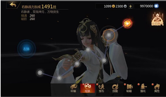 1、在經脈界面可看到“左脈”“右脈”兩條經脈,點擊其中一項可看到經脈走向,已貫通經脈將被點亮,貫通中及未貫通經脈灰暗