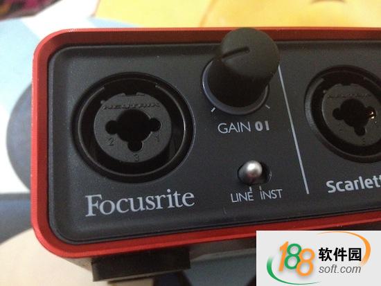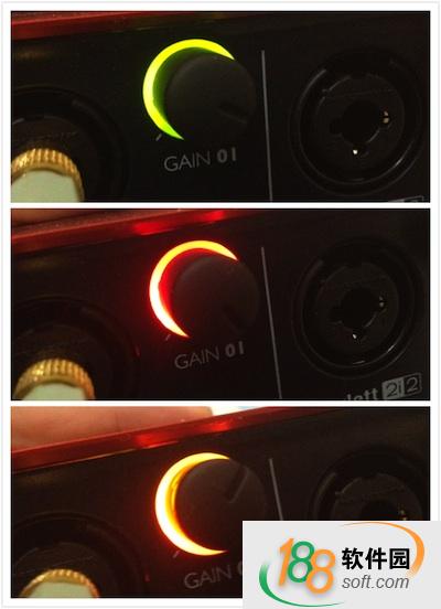 富克斯特(Focusrite) 2i2聲卡正面是2個(gè)XLR/TRS混合輸入接口,每個(gè)都可同時(shí)連接XLR卡儂話筒、大兩芯吉他/貝司和大三芯線路信號(hào),由于2i2上還有48V幻相供電按鈕,所以它也可以連接電容話筒(如圖2)。兩個(gè)接口旁邊的增益旋鈕很有意思,它們周圍帶有一圈多彩LED燈,當(dāng)發(fā)出綠色光的時(shí)候證明信號(hào)正常(至少不到-24dBFS),變成桔色表示快到極限了,紅色的話就提示你信號(hào)已經(jīng)達(dá)到0dBFS了,爆音了(如圖3)!不過無法通過它來判斷出具體的電平,要是做成一圈多段LED燈就可以當(dāng)電平表用了,那樣就更實(shí)用了。