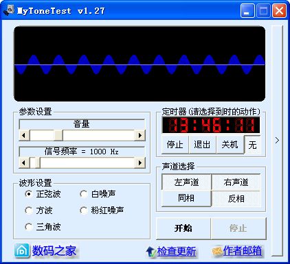 開始使用前,需要適當設置音量(軟件默認為最安全的-12dB)并選擇測試波形。