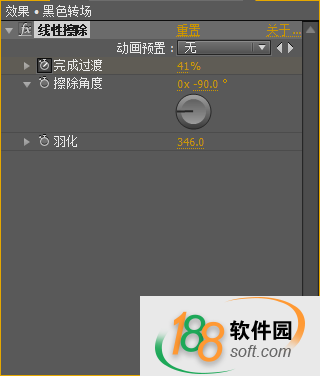 第六步,將分形層的 線性擦除 效果復制到黑色轉場(連同關鍵幀一起復制),并調整一下黑色轉場中的羽化值