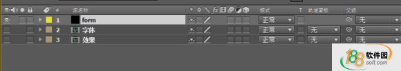 第八步,可以開始總合成了。將合成“字體”和“效果”拖入總合成,并取消其可視性,添加黑色固態層并命名為“form”,為form固態層添加效果trapcode form。