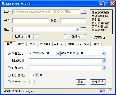 EasyPub是一款功能強大的TXT轉EPUB轉換器,可以將txt文本轉換成epub或是mobi,也可以將epub轉換成txt或者mobi。使用非常簡單,章節、版式、字體、書籍信息、css樣式、插圖可以很方便的制作和轉換epub或mobi電子閱讀書籍。