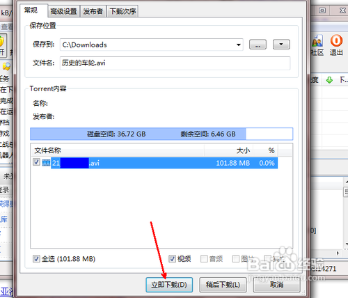 6如圖所示,軟件可以自動識別此bt文件的信息,比如資源的大小,名稱等信息。點擊確定之后,開始下載這個bt資源了。