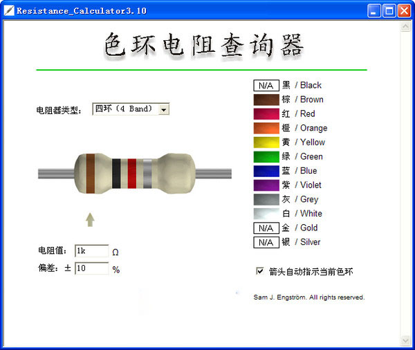 色環(huán)電阻查詢器采用真實(shí)的萬用表和電阻作為界面,操作簡單,形象的顯示出計(jì)算色環(huán)電阻的整個(gè)過程,使用者很快就能掌握如何計(jì)算色環(huán)電阻阻值,能夠計(jì)算出四環(huán)、五環(huán)。并且能計(jì)算出儀表中高精度電阻的數(shù)值。 &nb