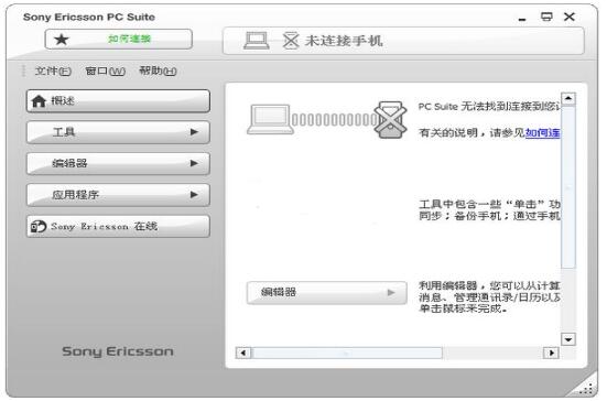 Sony Ericsson PC Suite是索愛一套免費PC套件,中文界面,用來增強Sony Ericsson 移動電話的功能。按提示連接開啟套件,然后你點下 如何連接,然后按提示點到下一步,一直到