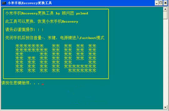 小米recovery可以更換、恢復小米手機Recovery,工具使用方法簡單,其實就是個批處理。電腦上要安裝好fastboot的驅動。首先將手機關機,然后按住音量-、米鍵和電源鍵進入fastboot模
