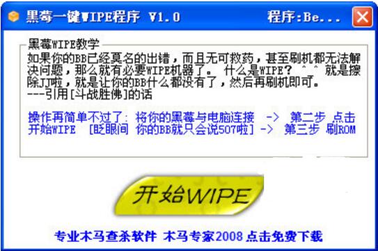 本款黑莓wipe工具7230親測可用,對于黑莓手機來說出錯是經常的事,WIPE也是隨時需要的,一鍵WIPE,獨立一個文件運行即可。是格式化手機及刷機必備工具,總之使用本工具后手機如同電腦系統安裝前進行