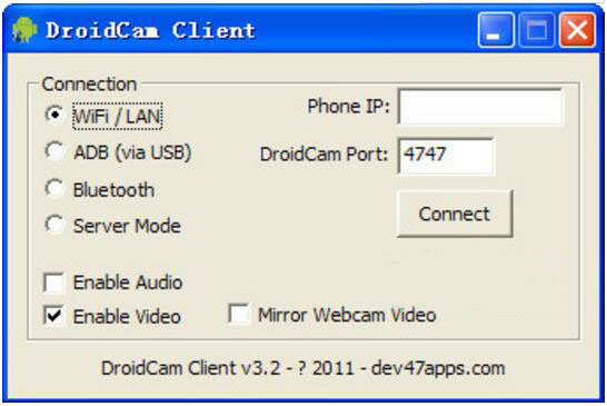 droidcam客戶端含手機客戶端和電腦客戶端,當無線攝像頭來使用是最簡單的,先打開手機WiFi并連接上無線路由,然后在手機上啟動DroidCamX,再啟動PC端,連接方式選擇WiFi/LAN,再將手