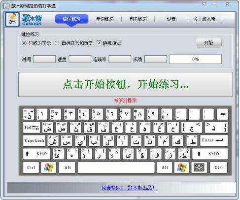 歌木斯阿拉伯語打字通是一款歌木斯網(wǎng)研發(fā)的打字練習(xí)軟件免費(fèi)軟件,主要有一下特點(diǎn): 1.包括鍵位練習(xí),單詞練習(xí),句子練習(xí); 2.內(nèi)置輸入法轉(zhuǎn)換程序,無需安裝任何阿拉伯語輸入法(101和10