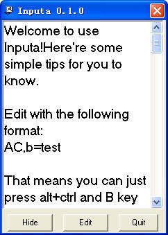 Inputa是一個用于快捷輸入的小軟件。通過設(shè)置,你可以使用Ctrl,Alt,Shift與字母等其他按鍵的組合鍵快速輸入文字。 你可以將用戶名、電話號碼等常用信息保存,然后可以方便地用快捷鍵填寫表單中