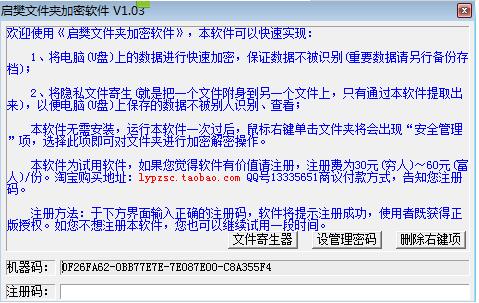 歡迎使用《啟樊文件夾加密軟件》, 本軟件可以快速實現(xiàn): 1、將電腦(U盤)上的數(shù)據(jù)進行快速加密, 保證數(shù)據(jù)不被識別;即本軟件瞬間讓電腦上的 數(shù)據(jù)快速加密變身,就是俗話說的連老媽的不認(rèn)得啦。