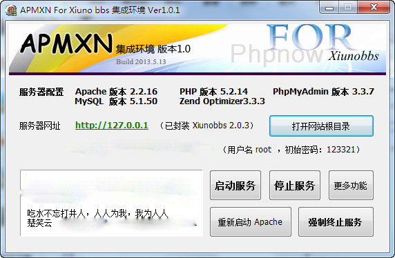 APMXN集成環(huán)境一鍵安裝包,本程序以PHPNOW1.56 + Xiubbs2.0.3 為基礎(chǔ)進(jìn)行融合,解壓即可使用! 包含組件 Apache-2.2.16 MySQL-5.1.50 PHP-