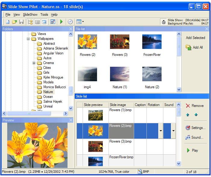 ColorPilot.Slide.Show.Pilot一款制作圖片幻燈和屏幕保護的工具,只需簡單拖拽圖片就可將它們組合為.exe文件或html格式的幻燈演示,有30種轉(zhuǎn)換效果、支持背景聲音添加并同步。